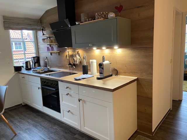 Die Küchenzeile ist vollständig eingerichtet. Dazu gehören selbstverständlich ein Toaster, eine Kaffeemaschine , ein Wasserkocher sowie ein großer Kühlschrank, eine Spülmaschine und ein Backofen. Spül und Geschirrtücher sind ebenfalls vorhanden.